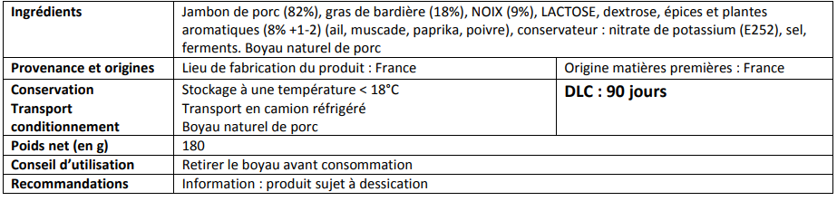 Saucisson sec aux noix, 200gr, 24.85€/kg.